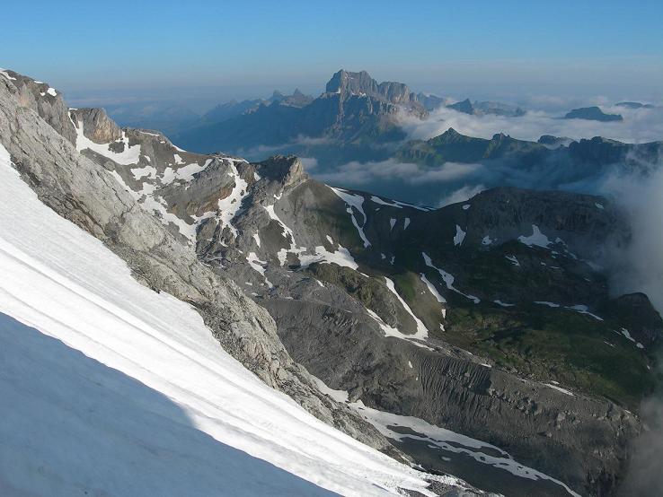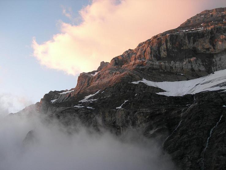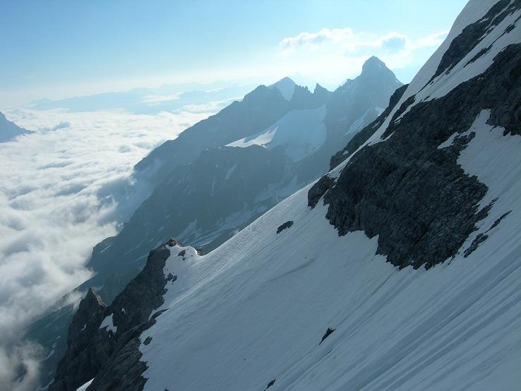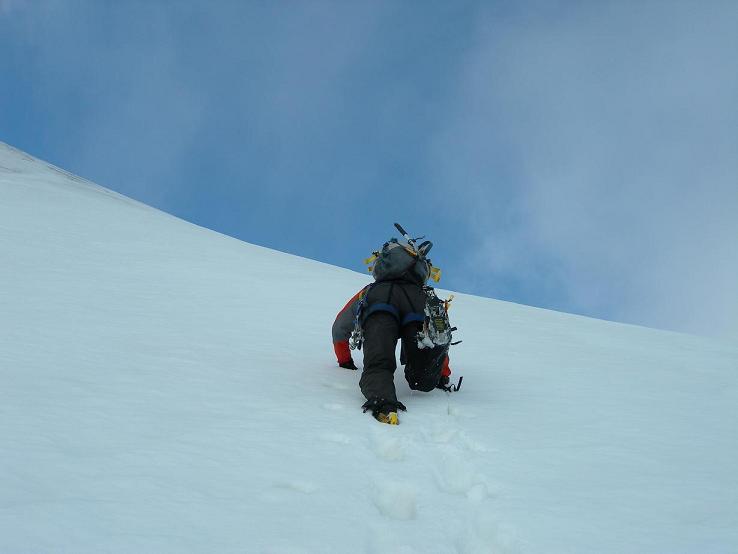 Schöne Nordwand mit hauptsächlich 45 Grad steilen Firnklettereien. Nach dem Einstieg bei der linken