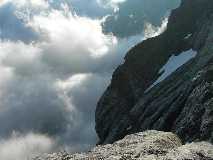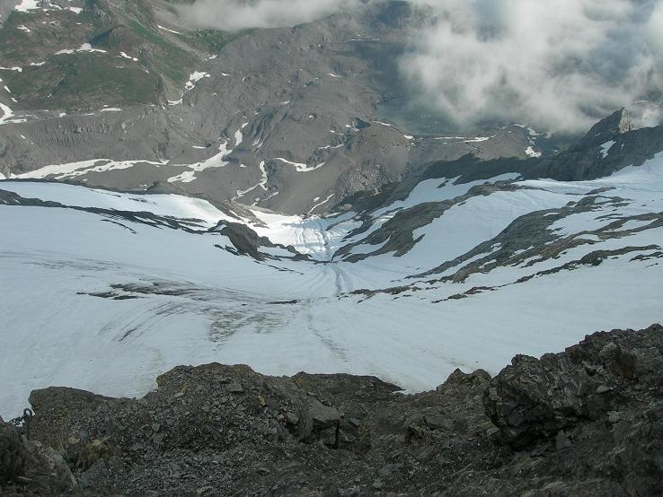 Wandhälfte klettert man im 1.-2. Schwierigkeitsgrad traversierend links hinauf, bis auf das markante Band. Nach diesem Linksquergang kommt man zur eigentlichen Firn- bzw. Eiswand.