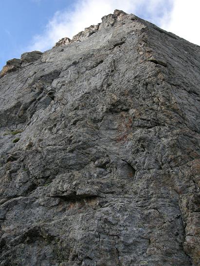 Abwechslungsreiche, kompakte Riss-, Verschneidungs- und Wandkletterei in alpinem Ambiente. Der klassische Einstieg befindet sich 10m westlich der Südturmlücke.