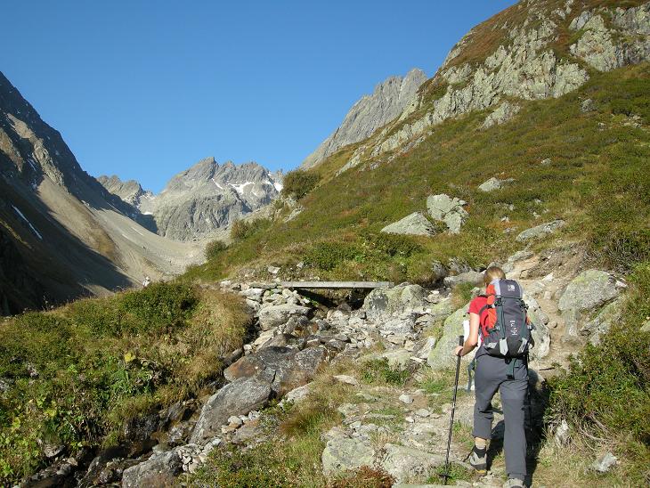 Der Einstieg befindet sich im linken Couloir auf der rechten Kante (ist markiert). Das rechte Couloir kann auch benutzt werden, ist aber ein wenig brüchig.