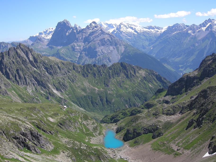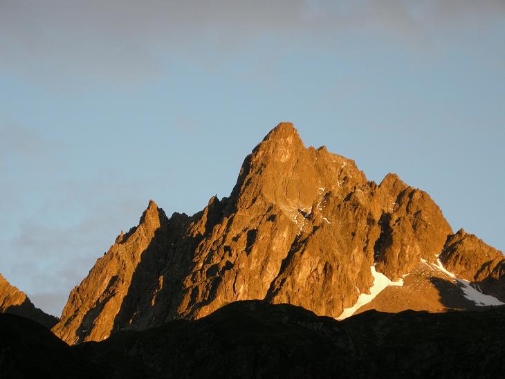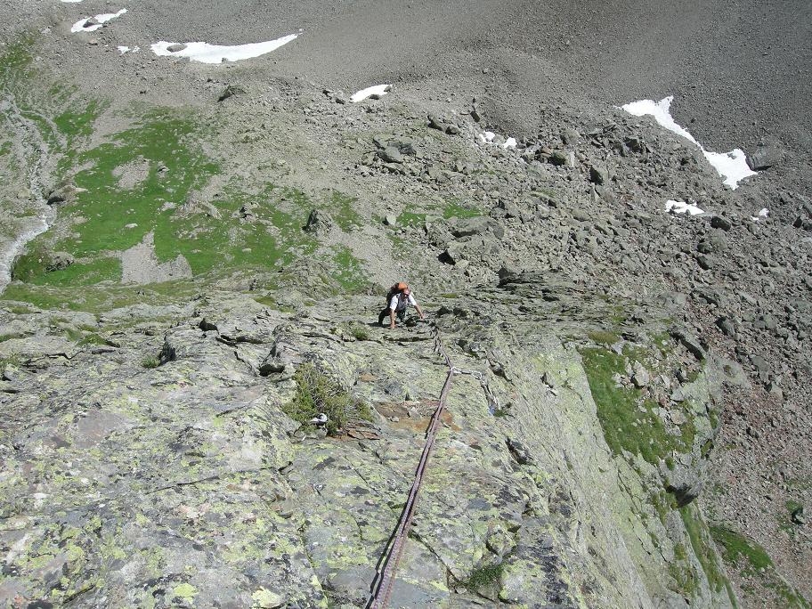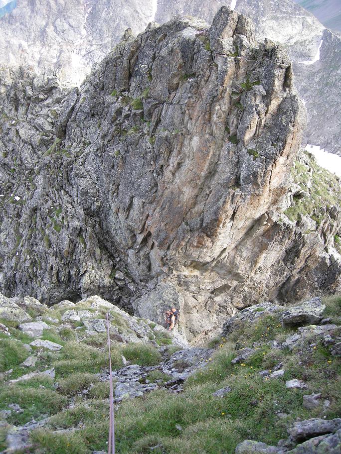 bis zur Abseilstelle. 1x25m Abseilen in die Scharte und von da in 70m leichter Kletterei auf den Gipfel. Alle nötigen Stände