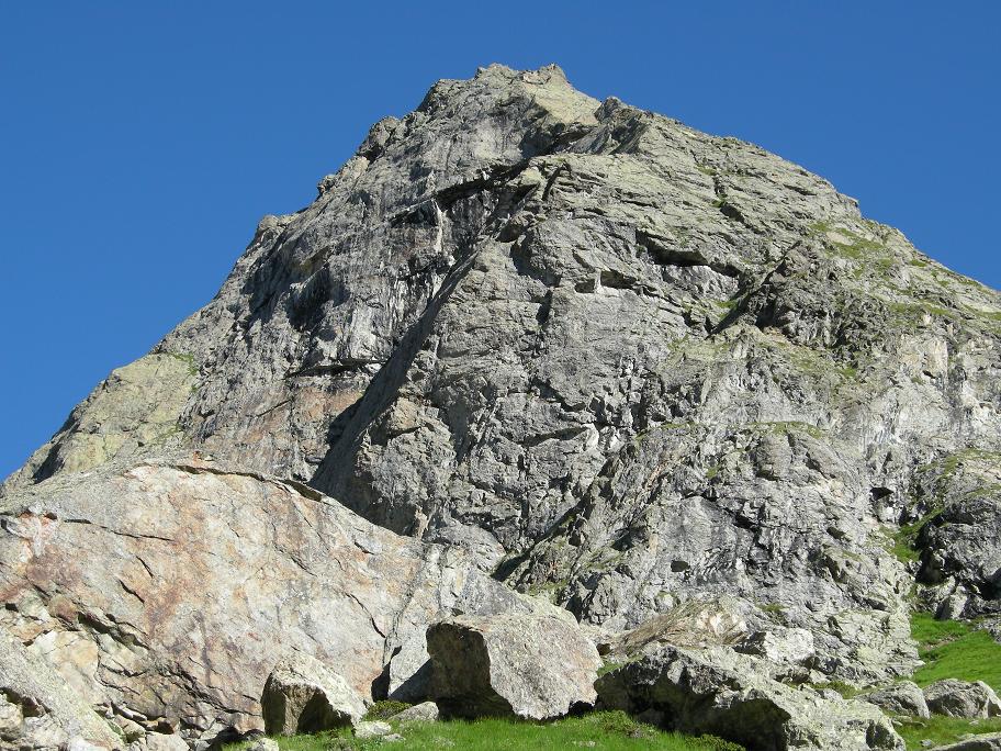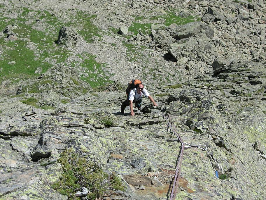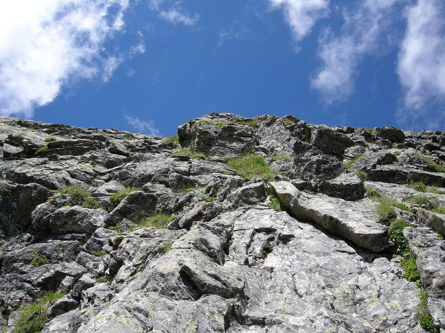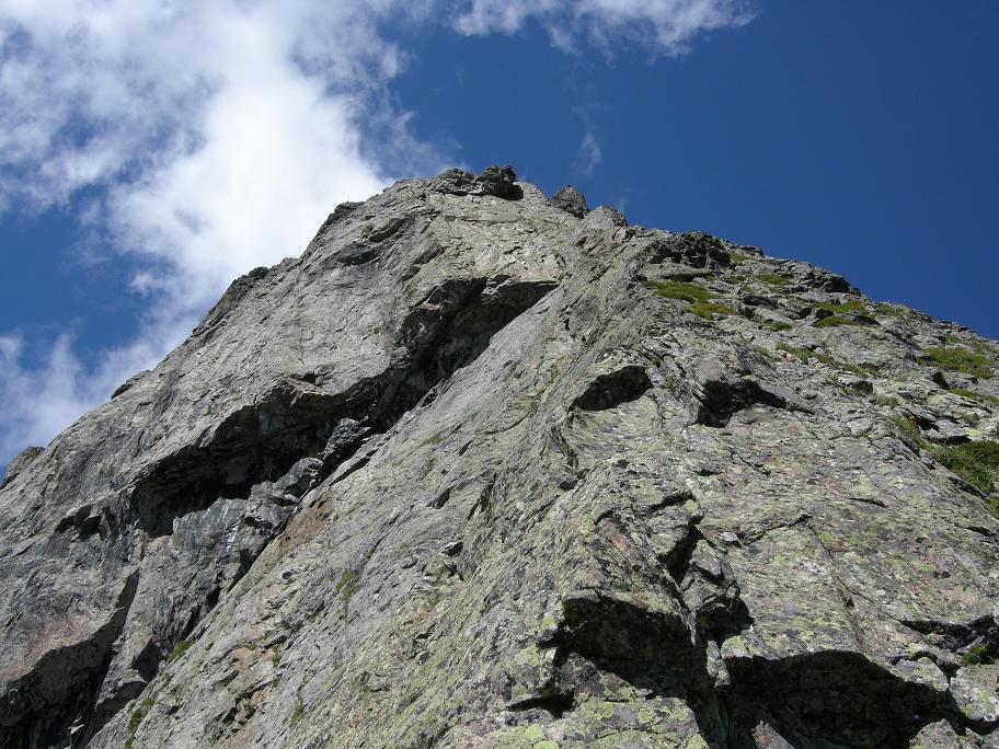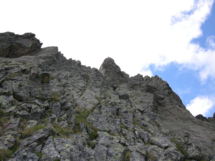 sind kompakte griffige Gneiskletterei im 3. bis 4. Grad. Von da an folgt man auf dem Grat bis zum ersten kleinen Turm (3).